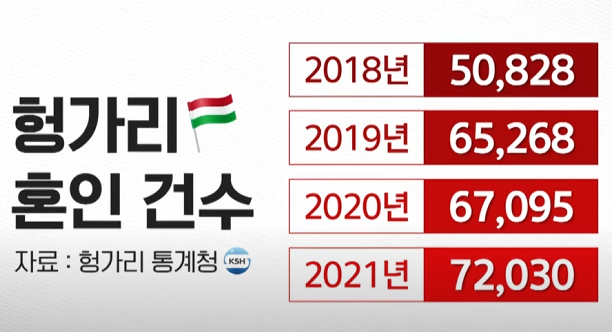 2019년 헝가리는 신부가 41세 이하인 부부에게 4천만 원 상당의 대출을 제공하고, 5년 내 자녀 셋을 낳으면 전액 탕감하는 제도를 도입했습니다. 이로 인해 혼인 건수가 눈에 띄게 증가했으며, 출산율도 소폭 상승했습니다.